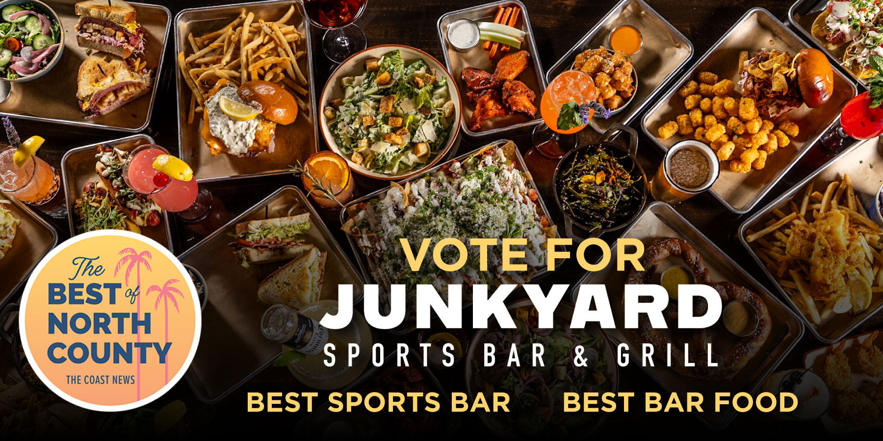 From jumbo wings, garden fresh salads and piled-high nachos to juicy burgers, tacos and our signature Junkyard Dogs our scratch made kitchen is sure to serve up something to satisfy your taste buds!